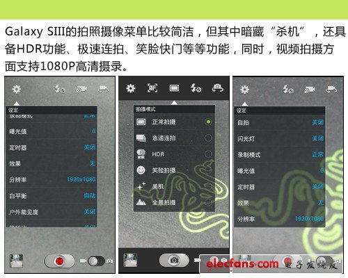 ? ? ? ?所謂背照式攝像頭相比普通前照式攝像頭好處就在于增大感光量,顯著提高低光照條件下的拍攝效果。所以同為800萬(wàn)像素,三星Galaxy SIII相比上一代產(chǎn)品還是具有很大提升的。不僅僅攝像頭硬件方面有所提升,軟件方面也提升不少,首當(dāng)其沖的就是20張高速連拍和8張最佳拍攝連拍功能。