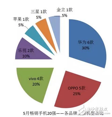 5月20款暢銷手機中,華為有6款、OPPO有5款、vivo有4款、樂視有2款,蘋果、三星和金立各有一款機型上榜。