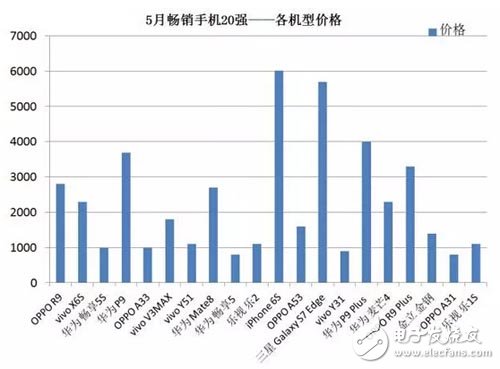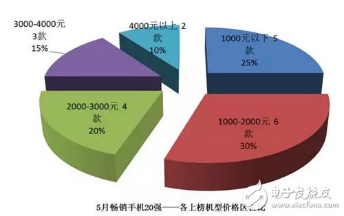 5月最暢銷的20款手機中,超過2000元售價的機型占9款;千元以上的機型占3款。 20款暢銷手機平均價格在2322元。
