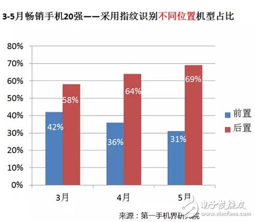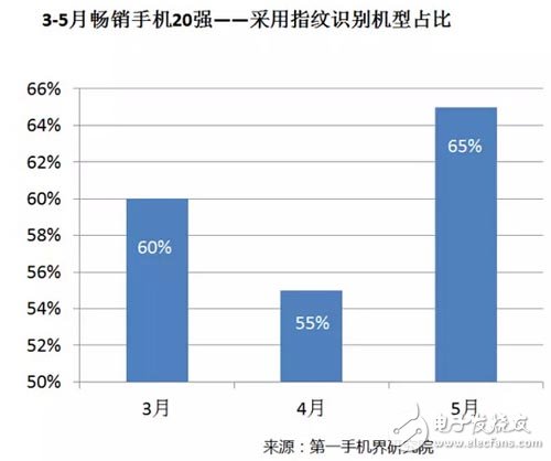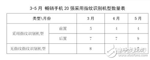 20款暢銷手機中,采用指紋識別功能的手機有13款,占比由4月的55%,上升至65%。