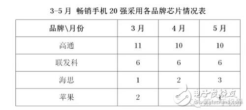 在暢銷手機10強中,采用高通芯片的有4款,采用MTK芯片也有4款,采用海思芯片有2款。