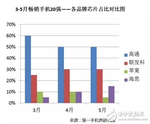 20款暢銷手機中,采用高通芯片的有10款,占比50%;采用聯(lián)發(fā)科(MTK)芯片的有6款,占比30%;采用海思芯片有3款,占比15%,采用蘋果芯片的一款。這一市場格局與4月基本雷同,只是因為華為P9 Plus殺入暢銷手機20強,讓海思芯片的市占率從10%,提升至15%。