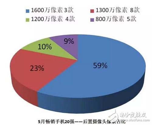 20款暢銷手機中,后置攝像頭采用1600萬像素的有3款,占比由4月的5%,上升至15%;采用1300萬像素的有8款,占比由4月的50%,下降至40%;采用1200萬像素的有4款,占比20%,沒有變化;采用800萬像素的有5款,占比25%,沒有變化。