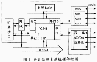??? 本系統(tǒng)具有面向應用的配置和靈活的擴展接口。由配置的不同,系統(tǒng)可支持4~8路話音處理。系統(tǒng)采用ISA總線與PC機接口。為了加強業(yè)務擴展能力,卡上保留一個外部接口,可用于功能擴展。在無擴展部分時支持4路話音處理。