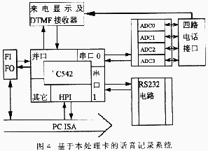 ??? 圖4是一個實用的處理卡。該卡可以同時記錄四路電話信息和撥入、撥出的電話號碼。FIFO是回放話音時的緩沖區(qū)。同時利用RS232電路把本機信息傳出或接受串行信號。