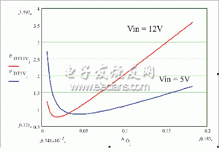 如圖5所示,功耗是裸片面積的函數(shù),周圍是針對輸入電壓為5到12V的頂部MOSFET的最合適值。這清楚地表面,損耗高度依賴于裸片面積以及如果裸片面積增加或減少時這些損耗所增加或減小的劇烈程度。