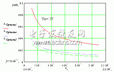 如下圖3所示,是在不同輸入電壓的情況下最優(yōu)化裸片面積和開關(guān)頻率之間的關(guān)系。顯然,在動態(tài)損耗和傳導(dǎo)損耗之間我們需要采取不同的混合,并且在高開關(guān)頻率下動態(tài)或開關(guān)損耗其支配作用,因此,迫使把裸片面積做得非常小。