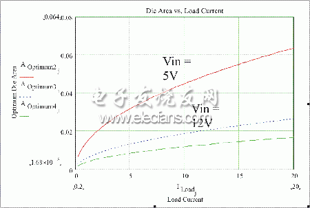我們以頂部MOSFET為例,下圖2所示為在不同輸入電壓時最優(yōu)化裸片面積和負載電流之間的關(guān)系。仔細地考察發(fā)現(xiàn),當輸入電壓從19V變到5V時,裸片面積增加。
