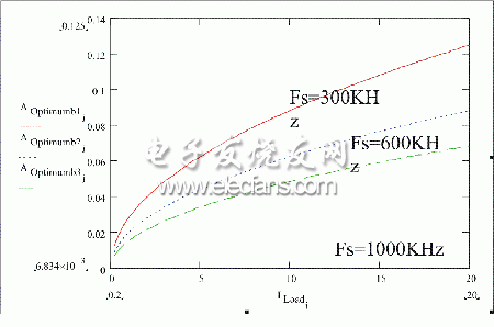 圖4:在同步整流器MOSFET不同開關(guān)頻率上的最優(yōu)化裸片面積是負載電流的函數(shù)。