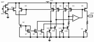 一種高精度電流源的電路,是通過V/I變換,將由帶隙基準(zhǔn)電壓電路產(chǎn)生的與溫度和電源電壓無關(guān)的帶隙基準(zhǔn)電壓轉(zhuǎn)換成與溫度和電壓無關(guān)的高精度基準(zhǔn)電流,并通過高精度電流鏡結(jié)構(gòu)產(chǎn)生所需的鏡像電流,有效地抑制了由于 溫度、電源電壓、負(fù)載阻抗的變化及干擾對電流源的影響。
