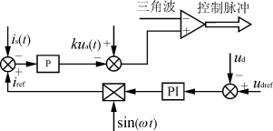 圖1? PWM整 流 器 主 電 路 圖 ??? 考慮到單相電路的對(duì)稱(chēng)性,把單相電路看作兩個(gè)雙半橋單元,相應(yīng)地把單相電源分為兩個(gè)電源,ua=-ub=un/2,電感也分為L(zhǎng)a=Lb=Ls/2,這樣就可以得到基于開(kāi)關(guān)函數(shù)的單相PWM整流器的狀態(tài)方程, ??? 對(duì)于a相 ??? L ??? 當(dāng)S1=1,S1′=0,uDN=Ud ??? 當(dāng)S1=0,S1′=1,uDN=0 ??? 因此式(1)可以寫(xiě)為 ????? L 同理可以得到 ???? L ??? 式(2)式(3)相加,并注意到ia+ib=0,ua+ub=0可以得到 ???? uNO=- ??? 這樣式(1)變?yōu)? ???? L ??? 式(2)變?yōu)? ???? L ??? 而對(duì)于直流側(cè)則有 ???? C ??? 圖1中,eL=0 ??? 利用式(4),(5),(6)就得到了單相PWM整流器關(guān)于開(kāi)關(guān)函數(shù)的狀態(tài)方程。這就為用Simulink搭建仿真模型提供了相應(yīng)的基礎(chǔ)。 3? PWM整流器的控制方案 ??? 該單相PWM整流器的控制框圖如圖2所示。參考電壓Udref與直流側(cè)輸出電壓Ud的差值經(jīng)PI調(diào)節(jié)后,與正弦同步信號(hào)相乘,產(chǎn)生參考電流iref,與相應(yīng)的輸入電流is(t)的差值形成電流誤差信號(hào),該誤差信號(hào)經(jīng)過(guò)比例調(diào)節(jié)后,加上相應(yīng)的輸入電壓的前饋,得到調(diào)制波信號(hào),用此調(diào)制波與三角載波相比較,就得到相應(yīng)的開(kāi)關(guān)脈沖,經(jīng)輸出去控制理想開(kāi)關(guān)。