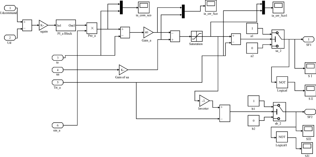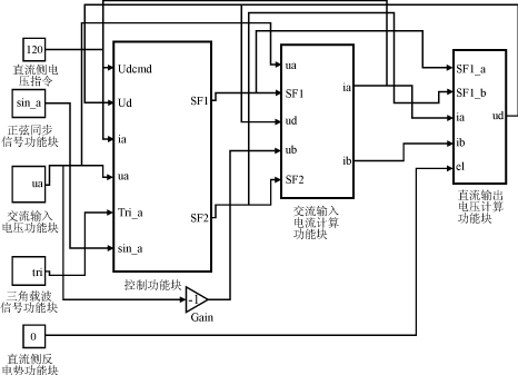 圖2 4? 單相PWM整流器的Simulink模型 ??? 圖3為用Simulink中的模塊搭建的單相PWM整流器的仿真模型,其中各個(gè)功能塊用子系統(tǒng)封裝好。主要有控制功能塊(用來(lái)計(jì)算開(kāi)關(guān)函數(shù)S1,S2,從而作為后級(jí)的輸入);交流輸入電流計(jì)算功能塊;直流輸出電壓計(jì)算功能塊;除此外,就是直流側(cè)電壓指令,正弦同步信號(hào)功能塊,交流輸入電壓功能塊,三角載波信號(hào)功能塊,及直流側(cè)反電勢(shì)功能塊(在本系統(tǒng)中為0)??紤]到對(duì)稱(chēng)性,凡是所需用到b相的信號(hào),給a相信號(hào)乘以-1就可以了。
