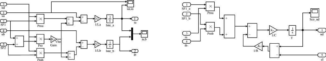 圖 3 單 相 PWM整 流 器 仿 真 模 型 ??? 圖4是各仿真子模型的內(nèi)部結(jié)構(gòu),可見(jiàn)交流輸入電流計(jì)算功能塊和直流輸出電壓計(jì)算功能塊完全是由狀態(tài)方程式(4),(5),(6)構(gòu)造的,而開(kāi)關(guān)函數(shù)的產(chǎn)生則是由控制策略決定的。