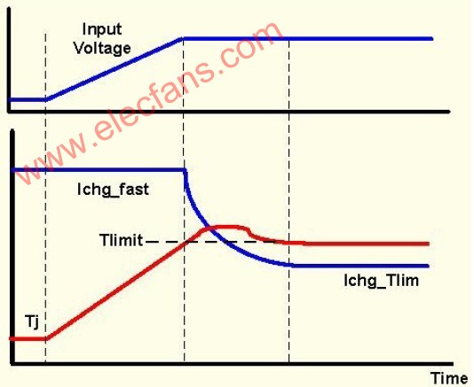 為解決此類(lèi)散熱問(wèn)題,可添加一個(gè)散熱回路,以降低充電電流,確保IC結(jié)點(diǎn)溫度低于熱關(guān)斷限。如圖3所示,bq2406X系列線性化充電器添加了散熱回路以支持運(yùn)轉(zhuǎn)。散熱回路在激活狀態(tài)下可有效的降低充電電流,降低充電器級(jí)供電MOSFET的功耗。??
