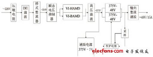 1517 研制了一臺(tái)600 W的功率因數(shù)調(diào)整電源,即 PFC電源 。該電源采用美國(guó)Vicor公司的高增壓諧波衰減(HAM)模塊和V375系列DCDC模塊,其中HAM模塊用于控制電源輸入電流,使其相位與輸入電壓相