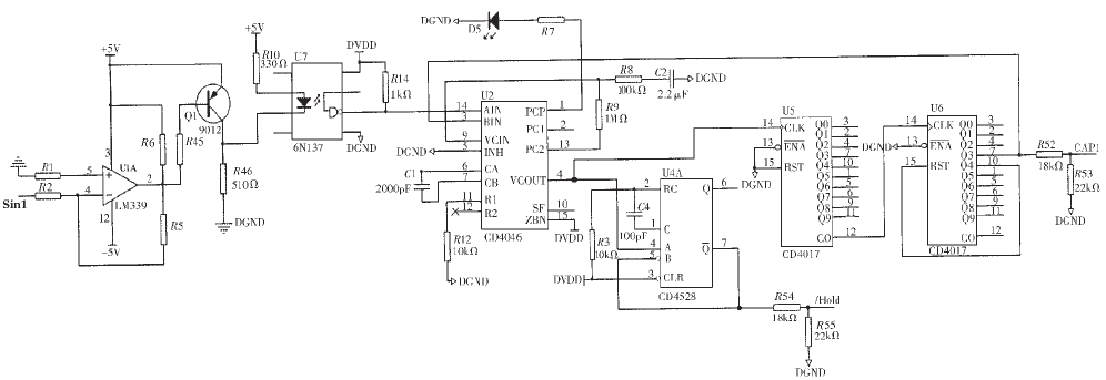 為了保證勵磁裝置采樣的精度,必須使采樣頻率具有快速的自適應(yīng)能力,同步跟蹤機端電量的頻率變化。 如圖3 所示,所設(shè)計的同步方波變換電路由遲滯電壓比較電路、高速光耦、鎖相倍頻電路和脈沖整形電路組成。其中,由U1A (LM339的1/4)和Q1 (9012) 組成的遲滯比較電路將正弦波輸入信號變?yōu)?~5V的同頻率方波信號,同時利用遲滯電壓特性消除輸入信號在過零點可能出現(xiàn)的抖動現(xiàn)象。高速光耦6N137把模擬部分和數(shù)字部分電路隔離開,同時進一步隔離了強弱電之間的電氣連接。鎖相倍頻電路由鎖相環(huán)電路U2(CD4046)和十進制分頻電路CD4017組成,按每周波采樣40點計算,兩片CD4017完成40分頻。由于鎖相環(huán)的相位負反饋作用,當鎖相環(huán)鎖定時(D5為鎖定指示燈),U6_7 的輸出信號與U2_14的輸入信號同步,也即與正弦輸入信號同步,此時U2_4的輸出信號頻率為正弦信號頻率的40倍,并且跟隨其同步變化。