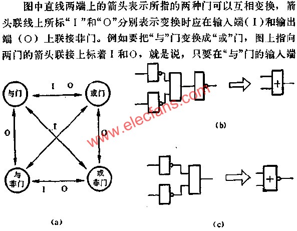 如果手頭只有一種門或二種門,我們可以設(shè)法通過適當(dāng)組合變成其它形式的門,暫稱其為變通應(yīng)用或組合應(yīng)用。圖A是采用四種基本門電路中的任何一種,在其輸入和輸出端上適當(dāng)聯(lián)接,就可變換成其它形式的門。