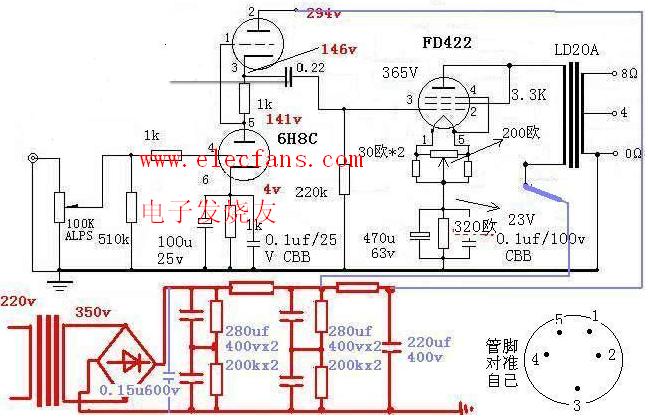 - [音頻電路] 甲類單端膽管FD422制作2×12W功放電路圖 2010-11-05