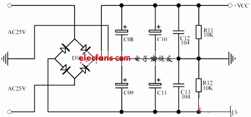 2495 TDA2030A 功放板的電源電路如下圖所示,為了保證功放板的音質(zhì),電源變壓器的輸出功率不得低于 60W,輸出電壓為 2*15V,濾波電容采用 2 個(gè) 3300UF/25V 電解電容并聯(lián),正負(fù)電源共用 4 個(gè) 3