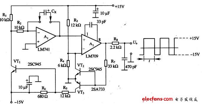 當(dāng)LM709輸出高電平時(shí),VT2飽和導(dǎo)通,VT2的C極電壓為0V。VT3、VT1都截止,+15V電源經(jīng)過R1、R2對(duì)Cx充電,LM741的輸出電壓逐漸下降。當(dāng)它降到0V時(shí),施密特翻轉(zhuǎn),輸出電壓變低電平(-15V)。此時(shí)VT2變截止,VT2的C極電壓升至+5V,鞏固了LM709的低電平輸出狀態(tài)。同時(shí)VT3、VT1獲得基極電流而導(dǎo)通,Cx經(jīng)過R2和-15V電源反向充電,LM741的輸出電壓逐漸升高。當(dāng)它升高到+5V時(shí),施密特再次翻轉(zhuǎn),輸出變高電平,完成一個(gè)周期。以上過程重復(fù)進(jìn)行,就形成周期振蕩。