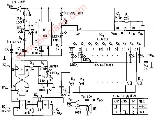 時(shí)基集成電路組成電子觸摸游戲機(jī)電路圖
