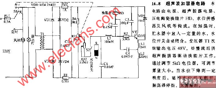 TD-5型超聲波微型霧化加濕器電路T電源變壓器 FU熔斷器 VT三極管 L1、L2、L3電感器 B壓電陶瓷片換能器S-N磁環(huán)浮子 SL水位開關(guān) RP1霧量調(diào)節(jié)電位器 RP2可調(diào)電阻。