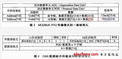 在工業(yè)以太網(wǎng)平臺,智能測控節(jié)點和上位機連接使用TCP方式,TCP幀數(shù)據(jù)直接使用表1中的MODBUSADU;在CAN網(wǎng)絡(luò)平臺,由于使用多主短幀方式,CAN數(shù)據(jù)幀仲裁場18位擴展識別符寫入目的站地址和PDU子幀序號,數(shù)據(jù)場寫入PDU的8字節(jié)子幀,以適合CAN數(shù)據(jù)幀的合并和拼接,數(shù)據(jù)格式如圖4所示。
