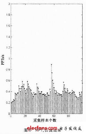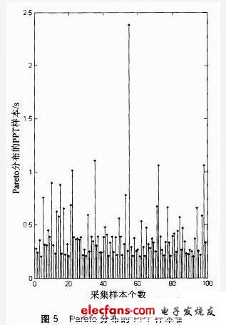 本文使用Matlab軟件對用PPTs衡量網(wǎng)絡(luò)質(zhì)量以實現(xiàn)自動投切的冗余算法進行仿真。由于以太網(wǎng)絡(luò)的數(shù)據(jù)包產(chǎn)生網(wǎng)絡(luò)延時的分布符合Pare to分布,其突發(fā)序列長度的性質(zhì)具有自相似特征,我們可以使用Pareto分布建立的自相似模型進行網(wǎng)絡(luò)仿真分析。本文使用Matlab7.1中GP RND()函數(shù)隨機生成的數(shù)據(jù),滿足Pareto分布(x=0.3,k=0.82,θ=σ=1),Paret0分布的PPT樣本值如圖5所示。圖6是使用式(3)計算后的仿真結(jié)果(σ=0.25)。