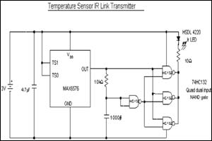 43 圖1電路提供了一個(gè)簡(jiǎn)單和經(jīng)濟(jì)的遠(yuǎn)程IC熱敏傳感器接口。溫度傳感器(max6576)是時(shí)間轉(zhuǎn)換器,集成了傳感器和必要的信號(hào)電子絕對(duì)溫度。它連接到接收器(一個(gè)簡(jiǎn)單的比較器)使用雙絞線(xiàn)電纜,同時(shí)進(jìn)行傳感器
