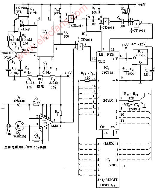 簡易三又二分之一位數(shù)字式頻率計電路圖