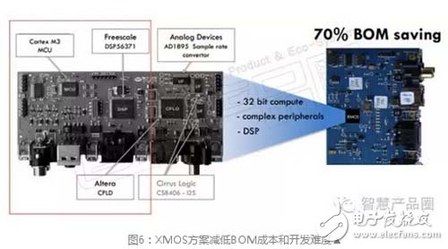 而此特性帶來(lái)的改變是,以往一些需要采用MCU、DSP和低端FPGA三顆芯片的方案,現(xiàn)在只用一個(gè)XMOS就能搞定。如圖6所示,該系統(tǒng)中主要器件有一顆ARM Cortex M3 MCU,一顆DSP芯片和一顆CPLD可編程邏輯器件、一顆采樣率轉(zhuǎn)化芯片和一顆音頻解碼芯片。除了AD1895采樣率轉(zhuǎn)換芯片和CS8406音頻解碼芯片不能取代外,系統(tǒng)中的三個(gè)主控芯片可以用一顆XMOS芯片取代。這樣的好處是,不僅整體方案成本可以大幅降低,而且也降低了設(shè)計(jì)復(fù)雜度,縮短了開(kāi)發(fā)周期。而且,木瓜電子更是進(jìn)一步做到:“現(xiàn)在我們的方案已經(jīng)可以取代了AD1895,可以用軟件實(shí)現(xiàn)SRC功能,這四個(gè)芯片撘起來(lái)的系統(tǒng),用一個(gè)XMOS芯片就可以實(shí)現(xiàn)了,成本很有優(yōu)勢(shì)。”邱松曉說(shuō)道。
