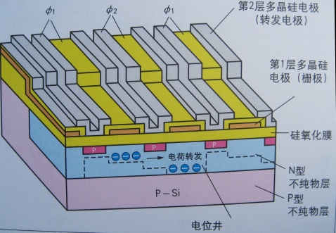 CCD具有形成于基板表面的N型不純物層的上面像鏈條一樣并排多個MOS型電極的結(jié)構(gòu)。轉(zhuǎn)發(fā)電極是重合2層或3層多晶硅的結(jié)構(gòu),盡可能縮小電極和電極的間隔形成。沿著排放的轉(zhuǎn)發(fā)電極,施加以時鐘脈沖的話,存在于電極之下的電荷將按順序向旁邊的電極之下移動。