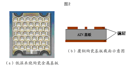 LED封裝熱阻主要包括材料(散熱基板和熱沉結(jié)構(gòu))內(nèi)部熱阻和界面熱阻。散熱基板的作用就是吸收芯片產(chǎn)生的熱量,并傳導(dǎo)到熱沉上,實(shí)現(xiàn)與外界的熱交換。常用的散熱基板材料包括硅、金屬(如鋁,銅)、陶瓷(如 ,AlN,SiC)和復(fù)合材料等。如Nichia公司的第三代LED采用CuW做襯底,將1mm芯片倒裝在CuW襯底上,降低了封裝熱阻,提高了發(fā)光功率和效率;Lamina Ceramics公司則研制了低溫共燒陶瓷金屬基板,如圖2(a),并開(kāi)發(fā)了相應(yīng)的LED封裝技術(shù)。該技術(shù)首先制備出適于共晶焊的大功率LED芯片和相應(yīng)的陶瓷基板,然后將LED芯片與基板直接焊接在一起。由于該基板上集成了共晶焊層、靜電保護(hù)電路、驅(qū)動(dòng)電路及控制補(bǔ)償電路,不僅結(jié)構(gòu)簡(jiǎn)單,而且由于材料熱導(dǎo)率高,熱界面少,大大提高了散熱性能,為大功率LED陣列封裝提出了解決方案。德國(guó)Curmilk公司研制的高導(dǎo)熱性覆銅陶瓷板,由陶瓷基板(AlN或 )和導(dǎo)電層(Cu)在高溫高壓下燒結(jié)而成,沒(méi)有使用黏結(jié)劑,因此導(dǎo)熱性能好、強(qiáng)度高、絕緣性強(qiáng),如圖2(b)所示。其中氮化鋁(AlN)的熱導(dǎo)率為160W/mk,熱膨脹系數(shù)為 (與硅的熱膨脹系數(shù)相當(dāng)),從而降低了封裝熱應(yīng)力。