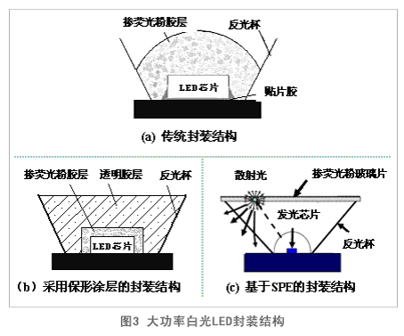(b)。但研究表明,當(dāng)熒光粉直接涂覆在芯片表面時(shí),由于光散射的存在,出光效率較低。有鑒于此,美國(guó)Rensselaer 研究所提出了一種光子散射萃取工藝(Scattered Photon Extraction method,SPE),通過(guò)在芯片表面布置一個(gè)聚焦透鏡,并將含熒光粉的玻璃片置于距芯片一定位置,不僅提高了器件可靠性,而且大大提高了光效(60%),如圖3(c)。
