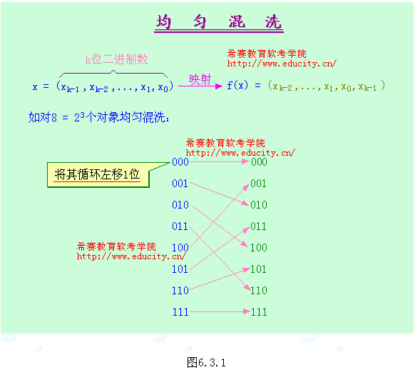 ?一般說來,為了對n=2k個對象均勻混洗,我們可用k位二進(jìn)制數(shù)x=(xk-1,…,x1,x0)來表示定義域中的每個對象。均勻混洗將x映射到f(x),得到f(x)=( xk-2,…,x1,x0,xk-1)。這是將x循環(huán)左移1位得到。