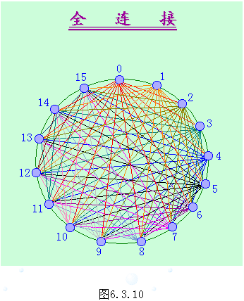 ??? 如果將結(jié)點(diǎn)度由2提高至3或4,即可得到如圖6.3.9所示的兩種帶弦環(huán)。增加的鏈路愈多,結(jié)點(diǎn)度愈高,網(wǎng)絡(luò)直徑就愈小。16個(gè)結(jié)點(diǎn)的環(huán)(圖6.3.8)與兩個(gè)帶弦環(huán)(圖6.3.9)相比,網(wǎng)絡(luò)直徑分別由8減至5和3。在極端情況下,圖6.3.10 的全連接網(wǎng)絡(luò)(completely connected network)的結(jié)點(diǎn)度為15,直徑最短,為1。