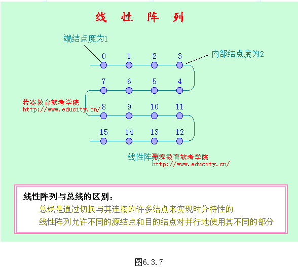 這是一種一維的線性網(wǎng)絡(luò),其中N個(gè)結(jié)點(diǎn)用N-1個(gè)鏈路連成一行(圖6.3.7)。內(nèi)部結(jié)點(diǎn)度為2,端結(jié)點(diǎn)度為1。直徑為N-1,N較大時(shí),直徑就比較長。等分寬度為1。線性陣列是連接最簡單的拓?fù)浣Y(jié)構(gòu)。這種結(jié)構(gòu)不對稱,當(dāng)N很大時(shí),通信效率很低。