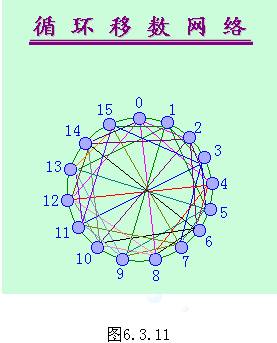??? 圖6.3.11所示的是一個(gè)循環(huán)移數(shù)網(wǎng)絡(luò),其結(jié)點(diǎn)數(shù)N=16,它是通過在環(huán)上每個(gè)結(jié)點(diǎn)到所有與其距離為2的整數(shù)冪的結(jié)點(diǎn)之間都增加一條附加鏈而構(gòu)成的。這就是說,如果|j-i|=2r,r=0,1,2,…,n-1,網(wǎng)絡(luò)規(guī)模N=2n,則結(jié)點(diǎn)i與結(jié)點(diǎn)j連接。這種循環(huán)移數(shù)網(wǎng)絡(luò)的結(jié)點(diǎn)度為d=2n-1,直徑D=n/2。