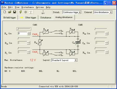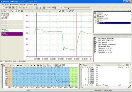 測(cè)試過(guò)程中,使用Vector公司提供的干擾儀CANstress,以制造出測(cè)試所需的干擾信號(hào)以及總線故障等測(cè)試環(huán)境。而系統(tǒng)中所連接的網(wǎng)絡(luò)示波器CANscope可以在物理層測(cè)試中捕捉CAN總線的物理信號(hào)。