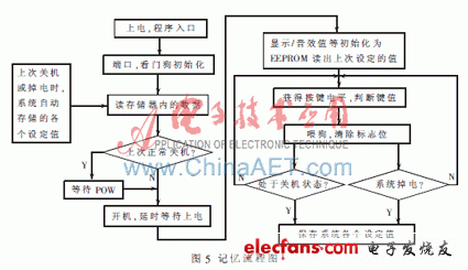 為滿足使用的要求,車載MP3播放器應(yīng)具有掉電記憶功能。掉電記憶功能可實(shí)現(xiàn)MP3播放器在掉電或關(guān)機(jī)后,上次各種設(shè)定值(如音量、音效、播放模式等)不會(huì)因斷電而復(fù)位,在下一次開(kāi)機(jī)時(shí)不需重新設(shè)定,可以直接調(diào)用上次設(shè)定值。記憶流程如圖5所示。