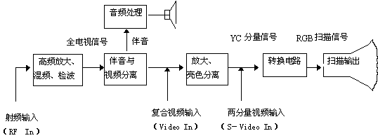視頻信號(hào)經(jīng)視頻放大,并把亮度、色度信號(hào)分離開,得到Y(jié)C分量信號(hào)。最后,把YC分量信號(hào)轉(zhuǎn)換成YUV、進(jìn)而轉(zhuǎn)換成RGB分量信號(hào)并送顯象管顯示。