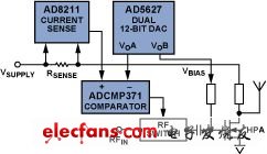在模擬方法中,使用一個ADI公司的ADCMP371比較器和一個RF開關(guān)控制輸入到功放的RF信號,如圖4所示。電流檢測放大器的輸出電壓可以直接與DAC設(shè)定的固定電壓比較。當(dāng)電流傳感器輸出端上產(chǎn)生的電壓高于設(shè)定電壓時,比較器可以控制RF開關(guān)上的一個控制引腳,使其電平翻轉(zhuǎn),并立即切斷功放柵極的RF信號,防止功放被損壞。這個直接控制方法繞過了數(shù)字處理,因此速度更快,并且能夠提供更好的校準(zhǔn)。