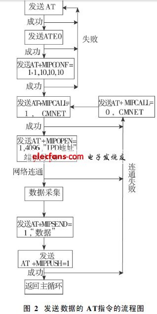 由于G20模塊帶有大多數(shù)的AT指令,可以方便軟件部分的設(shè)計(jì),在AT指令中利用了G20模塊最新提供的AT+MIPCONF指令來控制發(fā)出的信息在指定的時(shí)間內(nèi)返回,從而便捷的判斷出網(wǎng)絡(luò)在線的情況。具體的AT指令流程如圖2所示。