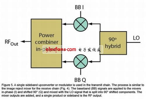 圖5:單邊帶上變頻器或調(diào)制器用于發(fā)射信號鏈中。此過程類似于接收信號鏈的鏡像抑制混頻器(圖4)?;鶐?BB)信號被施加到同相(I)和90°相移(Q)混頻器,并與分成90°相移分量的LO信號進(jìn)行混頻。增加了混頻器輸出,單個(gè)產(chǎn)物或邊帶為RF輸出。