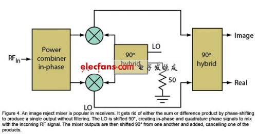 圖4:鏡像抑制混頻器在接收器中最受歡迎。它可以通過相移去掉和頻或差頻產(chǎn)物,產(chǎn)生單個(gè)輸出,而不需要濾波。LO進(jìn)行90°相移,產(chǎn)生同相和正交相位信號,與輸入的RF信號進(jìn)行混頻。然后混頻器輸出互相進(jìn)行90°相移,從而去掉部分產(chǎn)物。