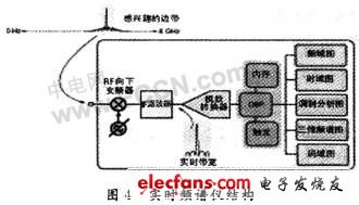 隨著數(shù)字射頻技術(shù)的發(fā)展,要求必須能捕獲并存儲(chǔ)一段時(shí)間的信號(hào),并可反復(fù)回放,分析信號(hào)隨時(shí)間的變化。另外,隨著頻譜利用率不斷提高,干擾將來(lái)自更臨近的頻點(diǎn),甚至同一頻率,這要求頻譜測(cè)試技術(shù)在發(fā)現(xiàn)和捕獲能力上實(shí)現(xiàn)本質(zhì)性的突破。實(shí)時(shí)頻譜儀的核心是基于快速傅里葉(FFT)的儀表,可以實(shí)時(shí)捕獲各種瞬態(tài)信號(hào),同時(shí)在時(shí)域、頻域及調(diào)制域?qū)π盘?hào)進(jìn)行全面分析,滿(mǎn)足現(xiàn)代數(shù)字射頻信號(hào)測(cè)試的需求,圖4所示為簡(jiǎn)化的實(shí)時(shí)頻譜儀結(jié)構(gòu)圖。