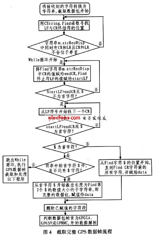 了解了GPS數(shù)據(jù)處理的四個(gè)狀態(tài)之間的相互轉(zhuǎn)換,下面論述一個(gè)完整的GPS數(shù)據(jù)幀的提取和處理,它是獲取車輛GPS定位數(shù)據(jù)的關(guān)鍵。一個(gè)完整的GPS數(shù)據(jù)幀的提取流程如圖4所示。