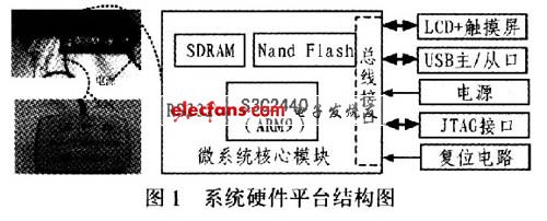 1)微系統(tǒng)核心模塊 由基于ARM920T的32位嵌入式微處理器S3C2440、SDRAM和Nand FLASH構(gòu)成和總線接口構(gòu)成。2片32 MB的HY57V561620構(gòu)成64 MB的SDRAM存儲器,用于運(yùn)行系統(tǒng)主程序。存儲容量為64 M×8 bit的Nand FLASHK9F1208UOM,因其具有掉點(diǎn)保護(hù)功能,用于存儲操作系統(tǒng)內(nèi)核、Bootloader的啟動代碼和用戶程序。