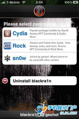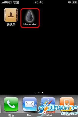 一旦iPhone或Touch重啟完成,越獄也就完成了,你將在iPhone或iPod Touch的桌面上看見黑雨blackra1n的圖標(biāo),下面的步驟需要連接WiFi或3G到互聯(lián)網(wǎng)。 運行桌面上那個黑雨blackra1n圖標(biāo)。