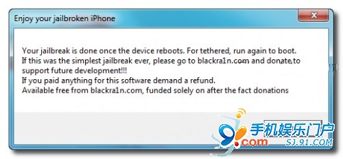 如果出現(xiàn)下面畫面在電腦上,點OK,繼續(xù)等待iPhone或Touch重啟。(等待iPhone重啟并進(jìn)入桌面后,點擊桌面上的黑雨的圖標(biāo)啟動黑雨軟件(該圖標(biāo)可能在第二屏,請用手指從右往左劃動桌面)